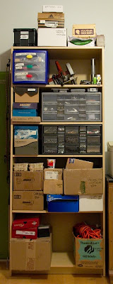 In particular, we had tools and hardware filling a hall closet plus more scattered through the basement. Now they mostly fit on this shelf, which I just completed organizing at great effort. There are also six tool boxes in the closet and a few other knicknacks here and there, and we did put a fair bit in the Goodwill pile (e.g., we now have three plant timers instead of six). Erin was impressed, which always makes me happy.